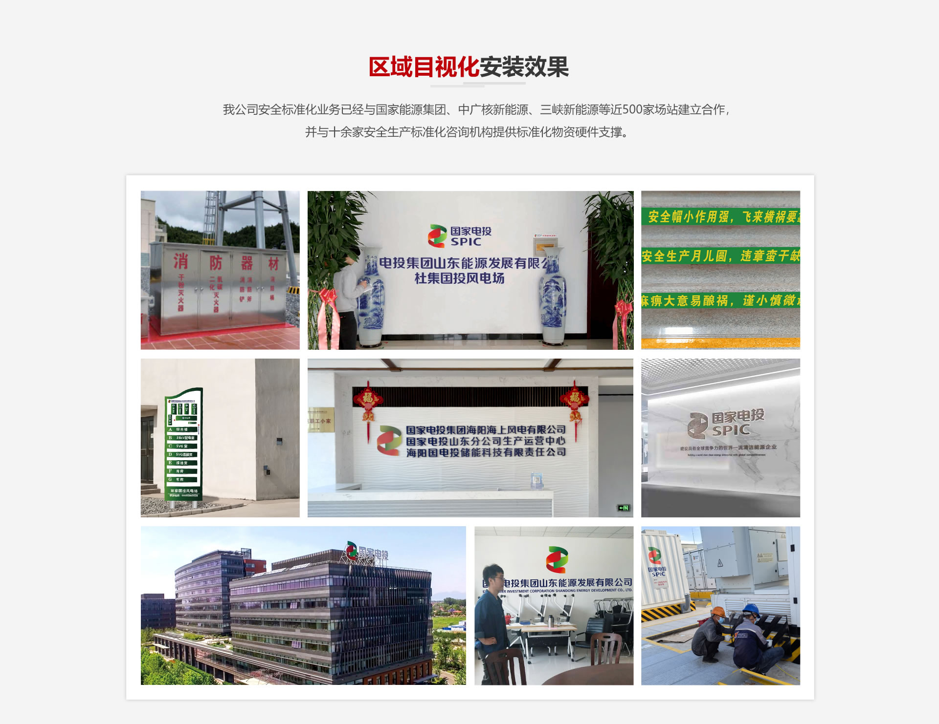 我公司安全标准化业务已经与国家能源集团、中广核新能源、三峡新能源等近500家场站建立合作,并与十余家安全生产标准化咨询机构提供标准化物资硬件支撑。