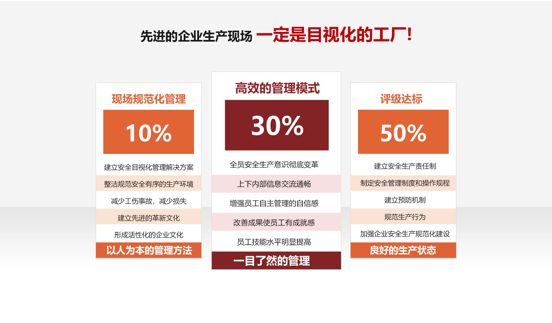 华泰安全目视化管理以安全法律、法规、标准和危害识别风险评价为基础,运用标识警示、6S管理、看板管理、定置管理等方法,结合企业VI、生产的特点、安全管理现状,将各方内容融合,策划一套系统的安全目视化管理解决方案。