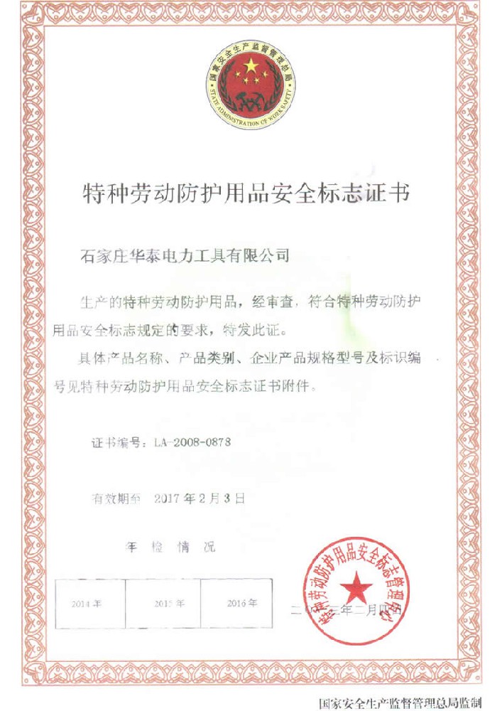 特种劳动防护用品安全标志证书